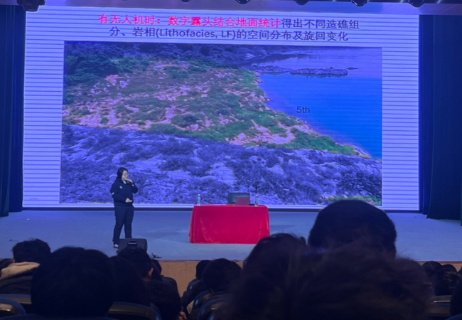 讲座上半场,成都理工大学沉积地质研究院副研究员、古地理研究室主任王夏老师以“玩石头也是正经事”为题,带领同学们走进地质科学的探索之旅。作为碳酸盐岩沉积与古生物礁研究领域的专家,王老师以轻松幽默的讲述,将专业地质知识转化为一个个生动的科学故事。从童年“玩石头”的经历谈起,到无人机技术为研究带来的革新,她通过“数字露头”等前沿技术(见图2),解读地球亿万年演变的历史轨迹,让同学们在趣味中感受地质研究的严谨与魅力。