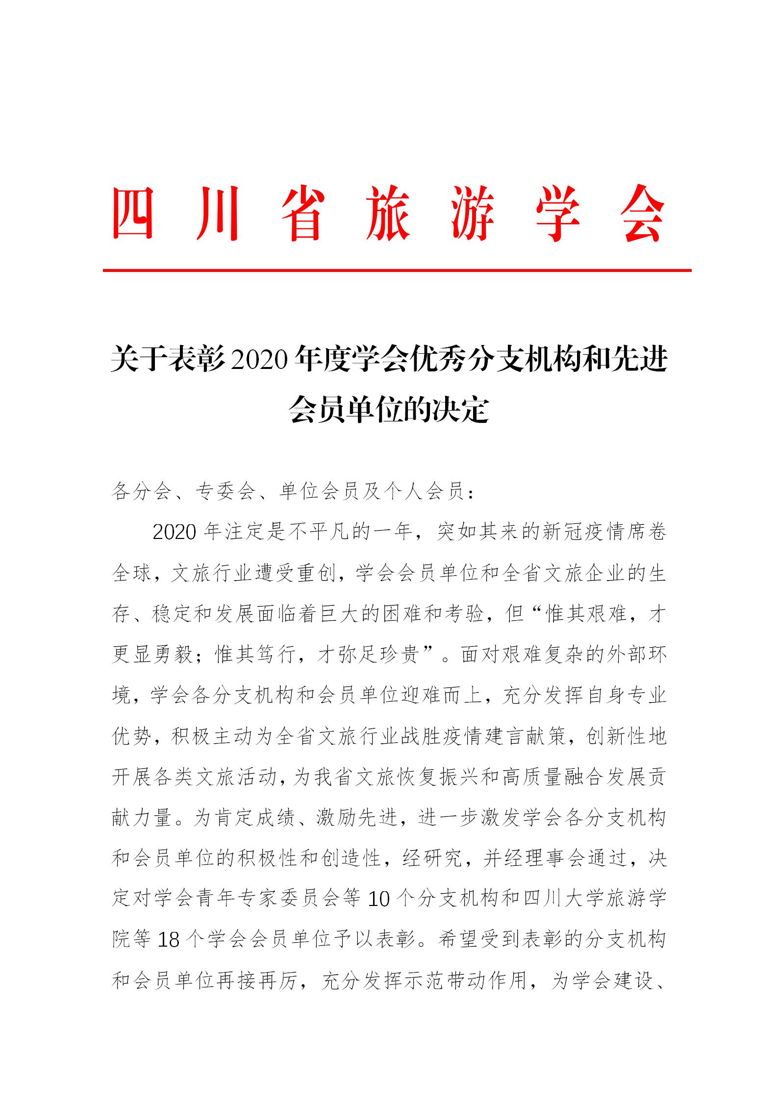 在会上,杨丹秘书长作了学会2020年工作总结,通报了2021年工作要点。苗玉砚常务副会长组织表彰了2020年度优秀分支机构和先进会员单位并授牌、赠书,太阳成集团tyc33455旅游学院获得先进会员单位称号。随后,四川大学旅游学院刘俊教授介绍了《四川旅游发展绿皮书》稿件征集及编写方案。最后,陈加林会长主旨发言。