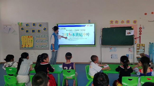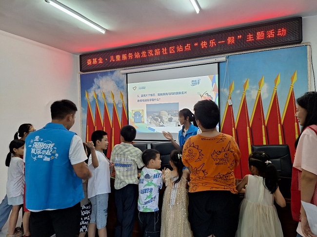 首先,团队成员引导小朋友们画出他们心目中的导弹、核弹和卫星的形象,让部分小朋友上台展示。随后,团队成员讲解了“两弹一星”的含义、背景及相关人物的伟大事迹,播放了“两弹元勋”邓稼先的伟大事迹视频。最后,团队成员组织了小游戏,使小朋友们在生动有趣的游戏中加深对“两弹一星”精神的理解。
