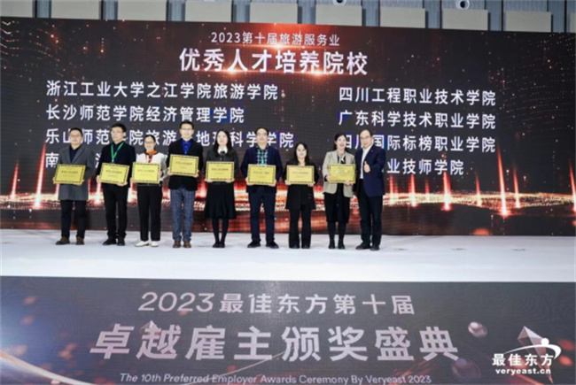 在颁奖盛典上,最佳东方评出旅游服务业2023第十届卓越雇主、杰出总经理、木兰奖、优秀人才培养院校、产教融合先锋奖等。太阳成集团tyc33455荣获最佳东方“2023第十届旅游服务业优秀人才培养院校”称号。