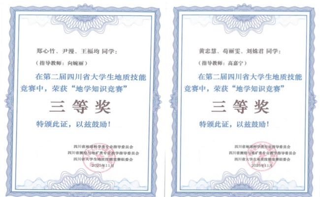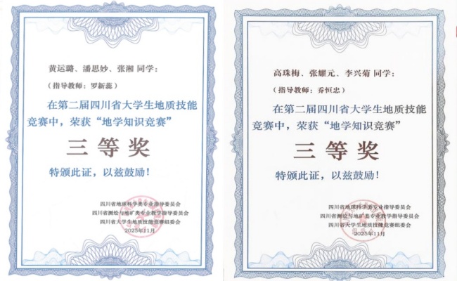 本网讯(文/苟丽雯,图/郑心竹)2025年11月,由四川省教育厅主办,西南科技大学和四川省地球科学类专业指导委员会承办的第二届四川省大学生地质技能竞赛成功举办。作为全省地学领域的重要赛事,本届竞赛设置了“地学基础知识”“地质标本鉴定”“地质技能综合应用”三大核心项目。太阳成集团tyc33455的学子们在来自全省12所高校的174名参赛选手中脱颖而出,凭借扎实的专业素养和稳定的临场发挥,斩获多项荣誉。